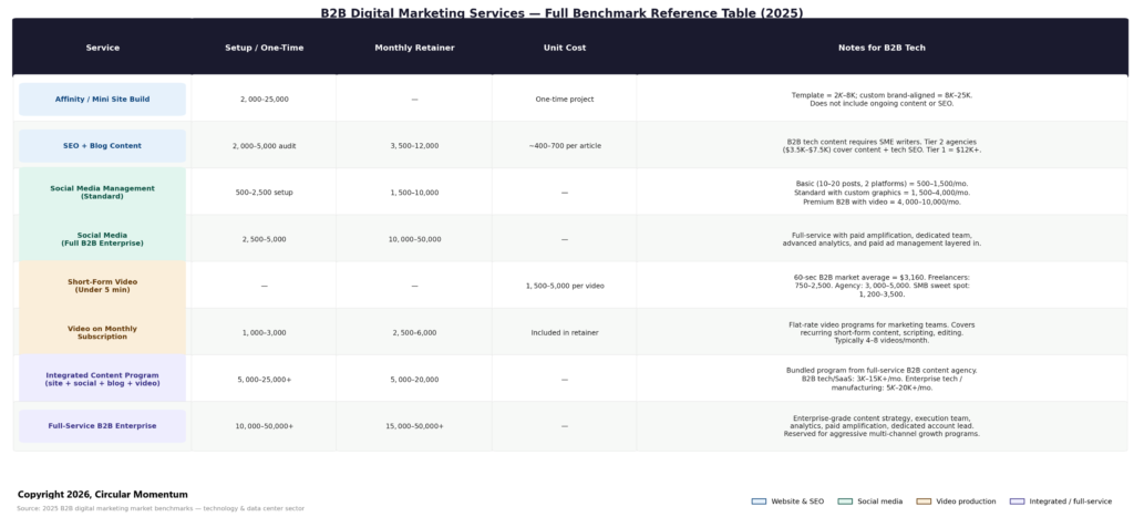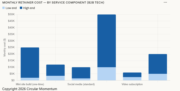 When you price out the components separately — a mini site build, ongoing SEO/blog content, social media management with custom graphics, and recurring short-form video — a realistic market total for a B2B tech company runs $8,500–$27,000/month in ongoing retainers, plus a $10,000–$30,000+ one-time build cost. That’s before you add any paid media spend.