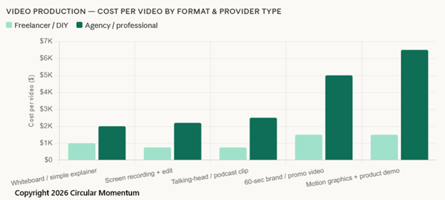 For video production, the average cost of a 60-second B2B marketing video is $3,160, with a sweet spot between $3,500 and $8,000 for quality and customization. SMB companies typically spend $1,200–$3,500 per video, while enterprise companies spend $4,600–$8,000 for top quality. On a subscription/retainer basis for ongoing video content, premium plans for marketing teams including 2D/3D options and a dedicated team run $2,550–$6,000 per month.