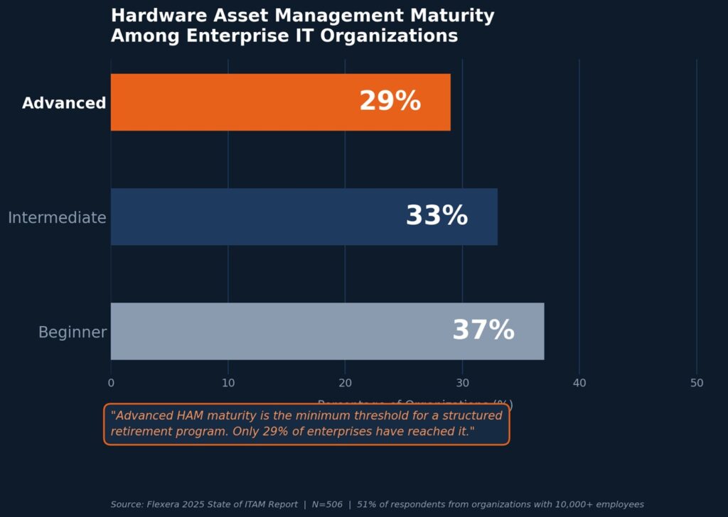 Put simply: if only 29% of enterprise IT organizations have reached advanced HAM maturity, then fewer than 29% could plausibly have a structured retirement program.