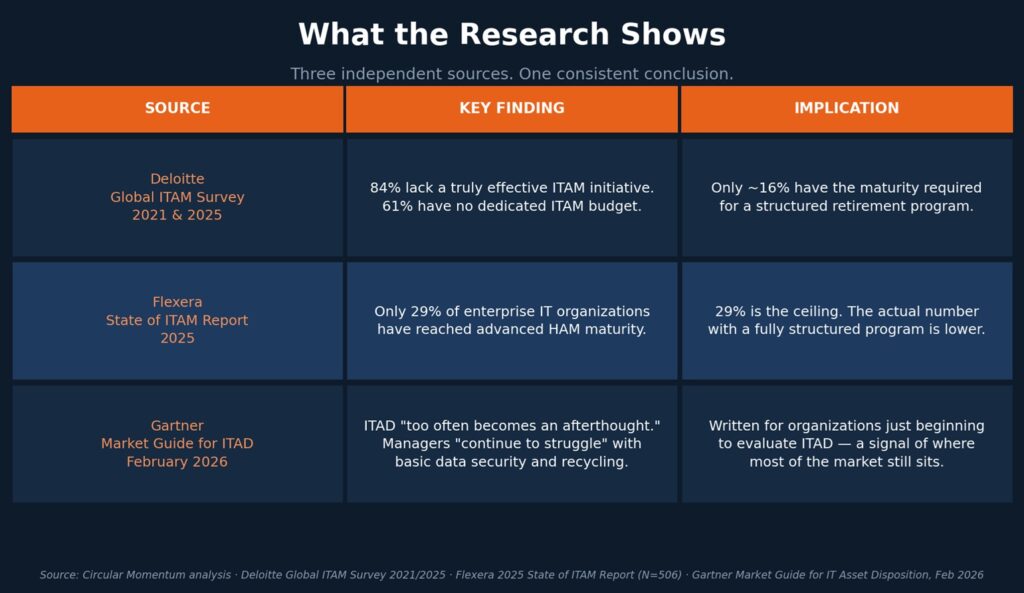 No single study has asked enterprise IT leaders directly: “Do you have a structured IT asset retirement program?” That question, framed that way, has never been put to a large-scale sample. But three independent research streams — each measuring different dimensions of IT asset management maturity — tell a remarkably consistent story when read together.